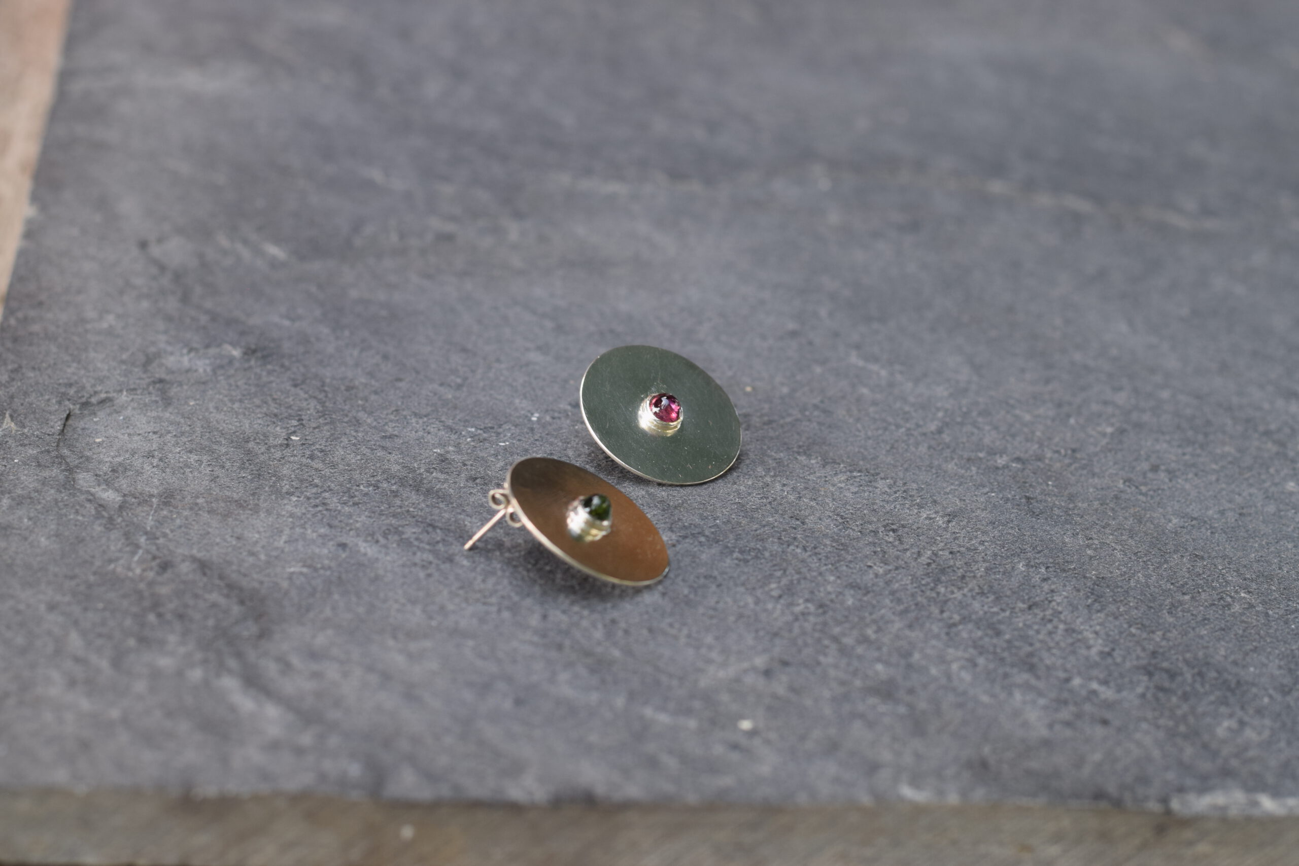 Ohrstecker 925/000 Silber, große Scheibe ca 20 mm mit je einem grünen und einem roten Turmalin.