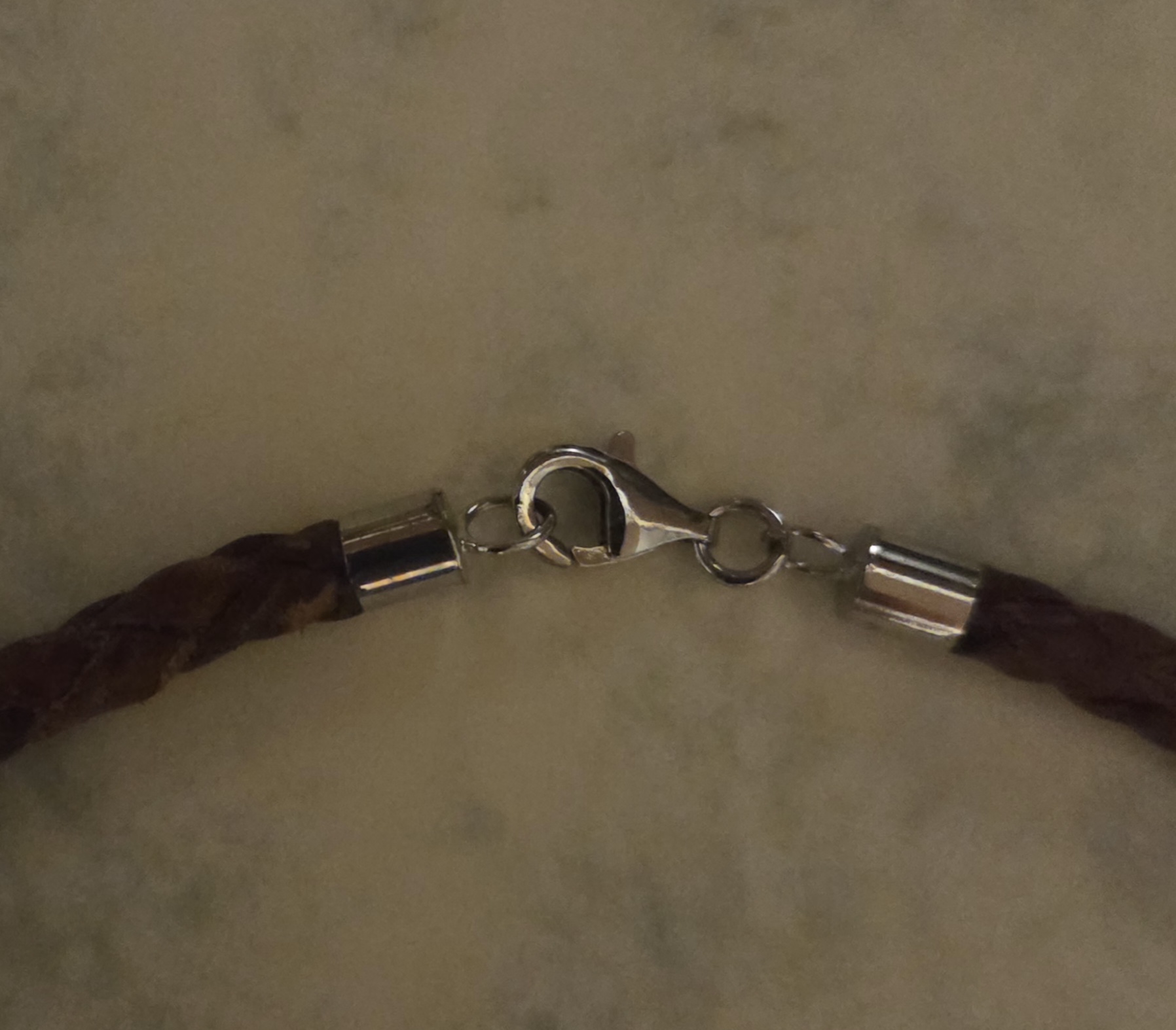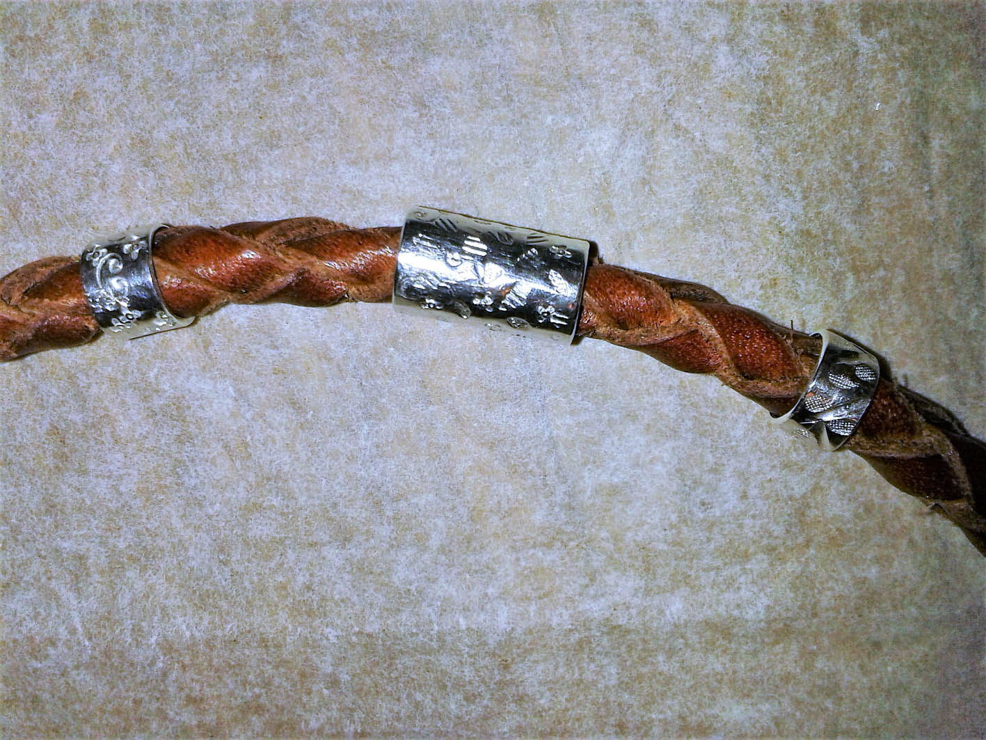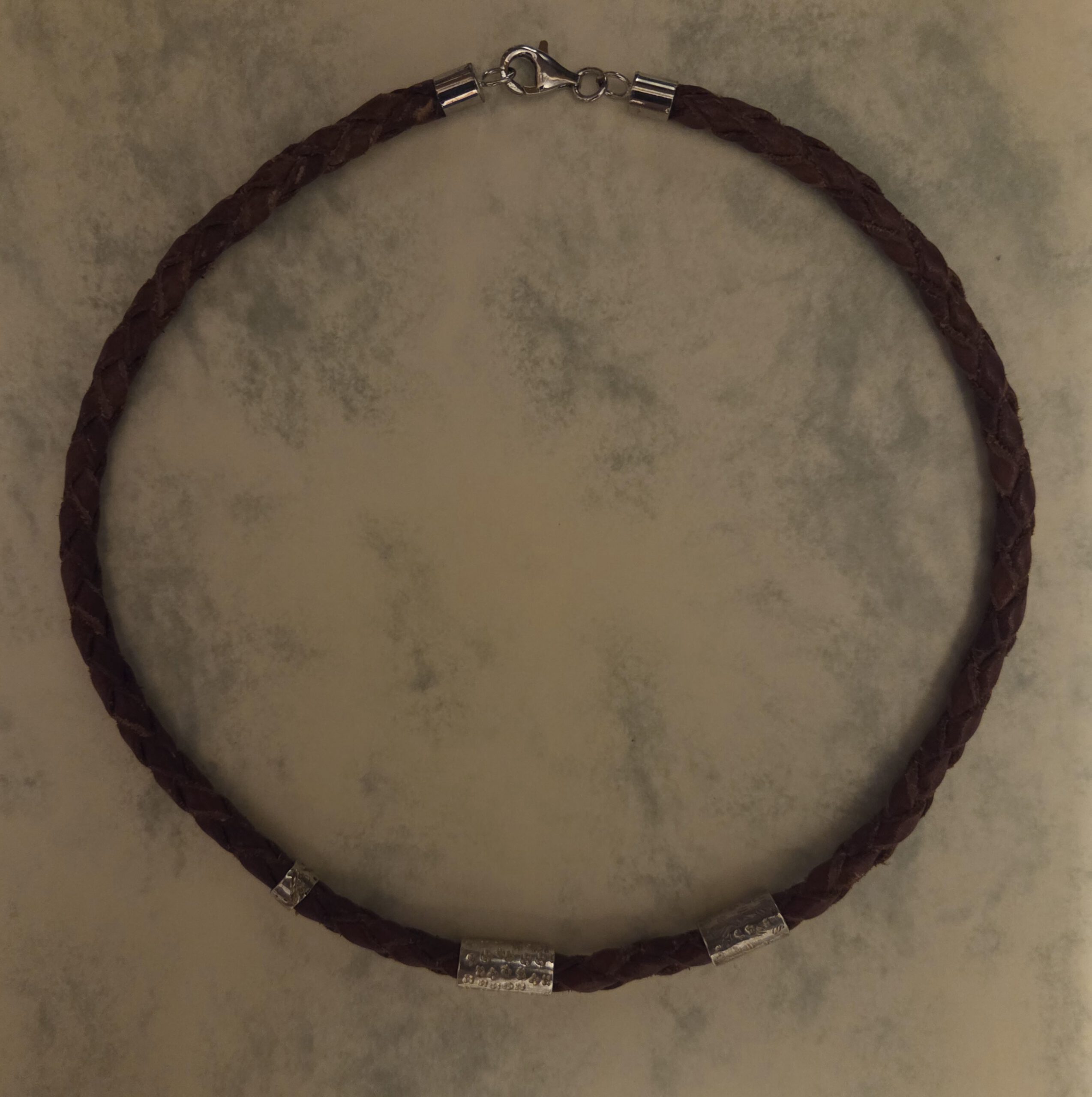 Lederband rund geflochten,Halsschmuck mit handgef. 925/- Silberelementen mit punziertem Muster, Verschluß Metallfederring.