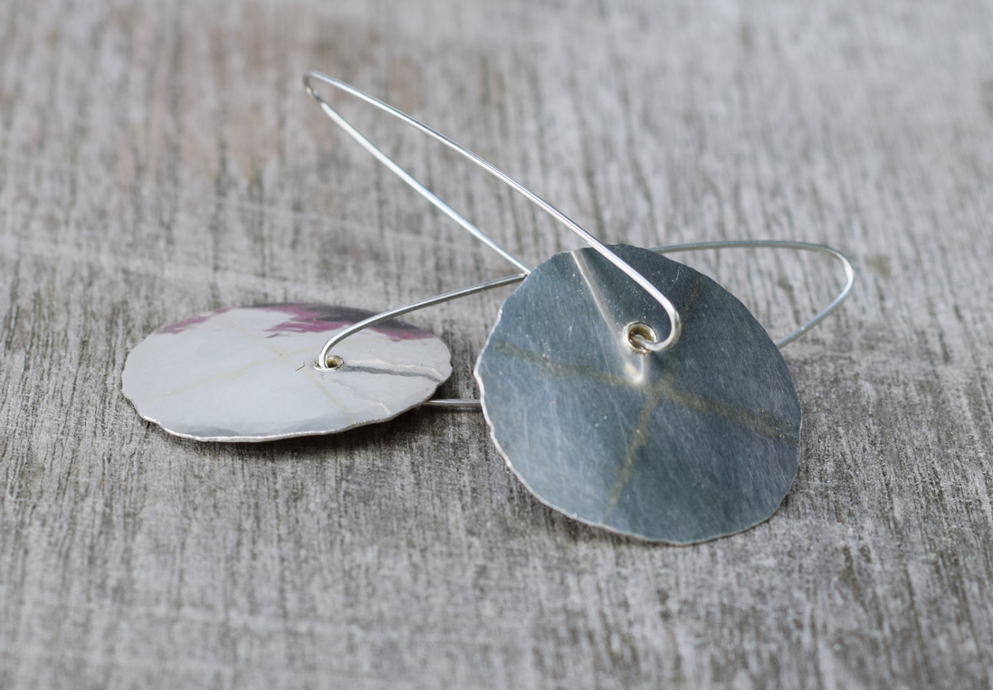 Ohrschmuck- Hänger 925/000 Silber geschmiedete Plättchen ca 20mm °/ mit Feingold touchierte Linien.
